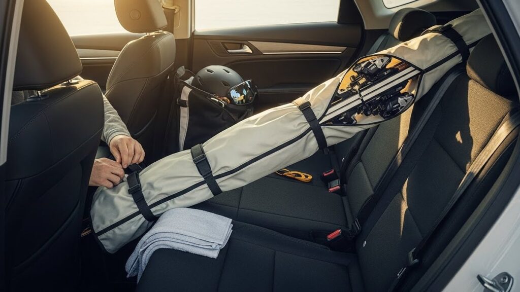スキー板を車内に安全に積む方法をわかりやすく解説します。後部座席の使い方や車種別の配置、固定手順で板と車を守ります。濡れ対策や到着後の簡単な手入れまで役立つポイントを紹介します。 -