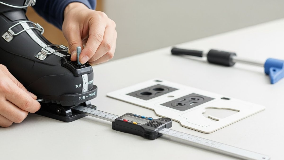 ヒールカップに収まるか、かかと部分に無駄な遊びがないかを見てください。センタリングは板上でブーツを装着し、足をまっすぐにしたときにエッジまでの距離が左右でほぼ同じなら良好です。微調整はビンディングの座金や取り付け位置で行えます。