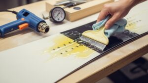 温度が高すぎるとソールを痛めることがあるので、最初は低めから試し、ワックスがスムーズに流れる温度を確認します。アイロンを板上で長時間停めないようにし、焦げや変色を防いでください。