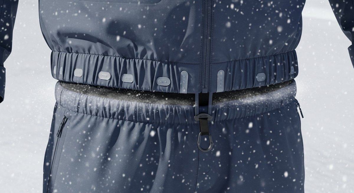 それぞれの部位で求められる機能が異なります。ジャケット裾はウェア全体のシール性を高めるために幅広い調整機構が付くことが多く、パンツ裾はブーツに合わせて収まりやすい形状や留め具が重要です。袖口は手首の動きを妨げない範囲でしっかり密閉できることが求められます。