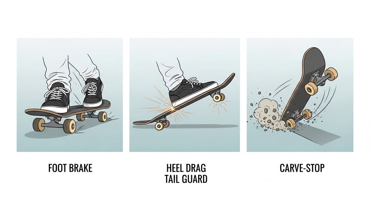 テールブレーキはボード後端を路面に押し付け、摩擦で減速する方法です。後ろ足の位置を後ろ端に寄せ、体重を軽く後ろに移して行います。テールが擦れる感覚を少しずつ強めて速度を落とします。
