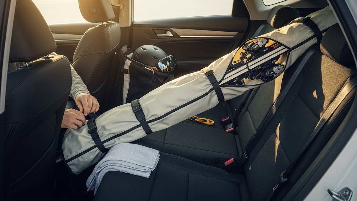 車内にスキー板を積むときは、まず板を保護するカバーやケースに入れ、後部座席を倒して横向きに平置きする方法が最も取り扱いしやすく安心です。これなら板の長さに合わせてスペースを確保でき、車内の荷物と一緒に固定しやすくなります。